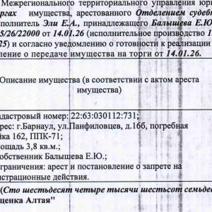 Нежилое помещение (погребная ячейка), кадастровый № 22:63:040413:295, площадь 3,4 кв.м., адрес: Алтайский край, г. Барнаул, ул. Деповская, д. 4В. Начальная цена 93 588 руб. (Трояновская Л.А., арест, запрещения регистрации) (45)