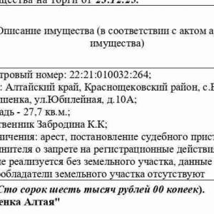 Нежилое здание (торговый киоск), 2006 г.п., кадастровый № 22:21:010032:264, площадь 27,7 кв.м., адрес: Алтайский край, Краснощековский район, с. Верх-Камышенка, ул. Юбилейная, д. 10А. Здание реализуется без земельного участка, данные о правообладатели земельного участка отсутствуют. Начальная цена 146 000 руб. (Забродина К.К, арест, запрещения регистрации) (2564)