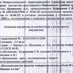 Лот№5 1/2 доля в праве собственности на нежилое помещение (погребную ячейку), кадастровый № 22:63:010414:2284, общая площадь 3,4 кв.м., этаж – подземный, адрес: Алтайский край, г. Барнаул, ул. Шукшина, д. 15А, погребная ячейка 313, ПСК № 18. Начальная цена 82 408 руб. 00 коп. (Кудрявцева С.В. (общая долевая собственность с Матвеевым А.В.), запреты на совершение регистрационных действий, арест) (55).